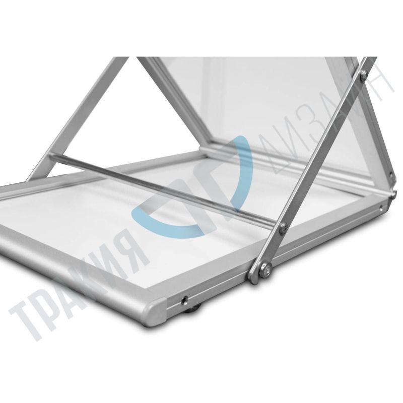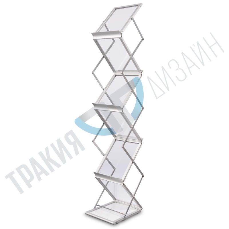 The foldable brochure stand is very convenient for mobile use. It's used for displaying brochures during expositions. The stand comes with acrylic racks for 4 types of brochures A4 format. While folded, the stand is very small and convenient for transportation. A transport sack is separately sold.