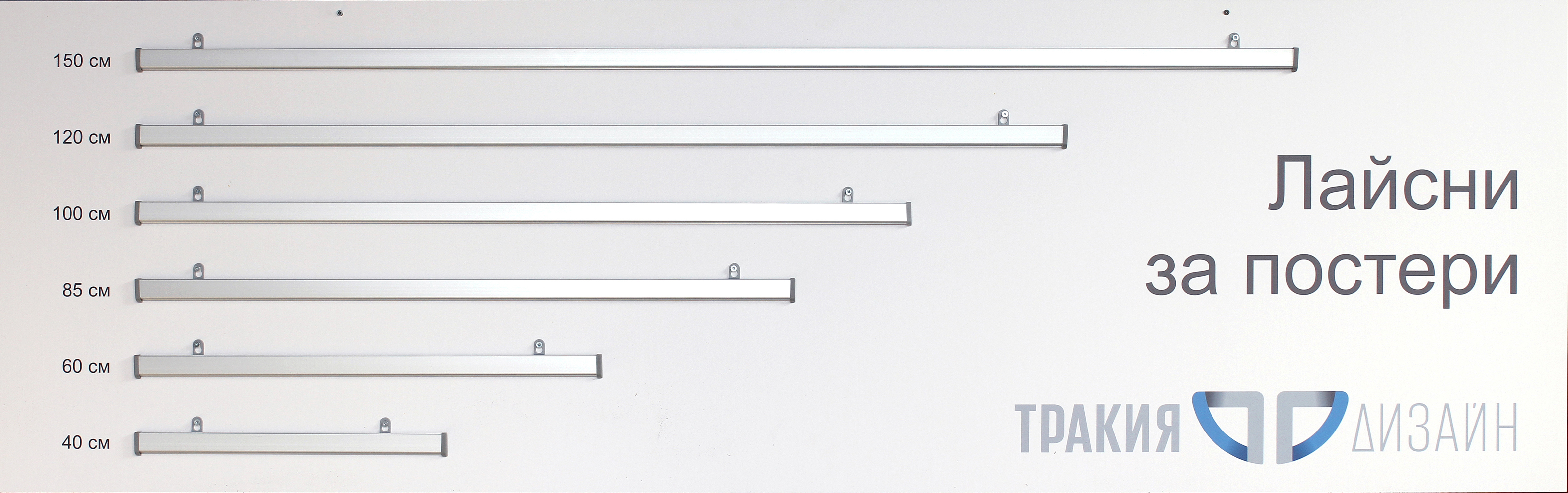 The strips are 100% aluminum. The profiles can be opened and the installation is easy and fast. They can be both hanging and on a wall. The weight of the lower strip is enough to stretch and tense the poster. We offer the following widths: 400mm, 600mm, 850mm, 1000mm, 1200mm and 1500mm.