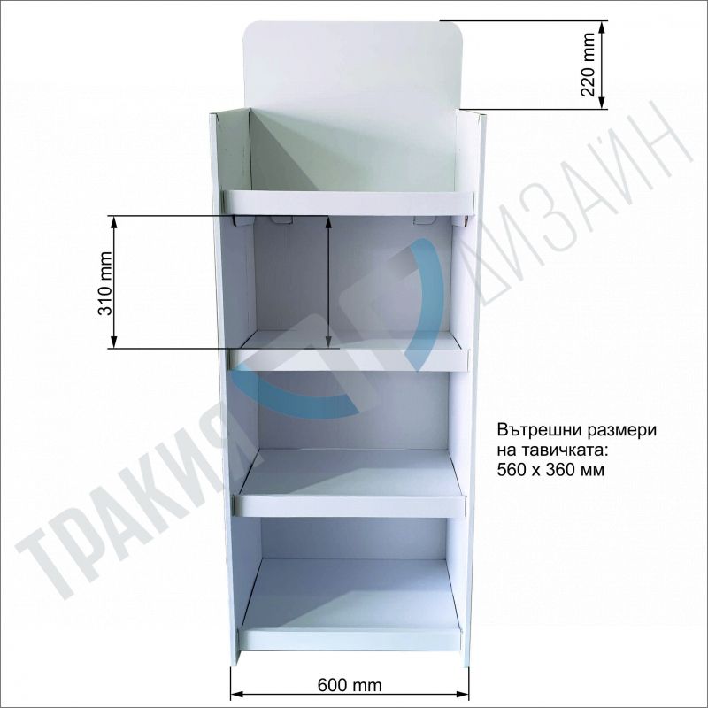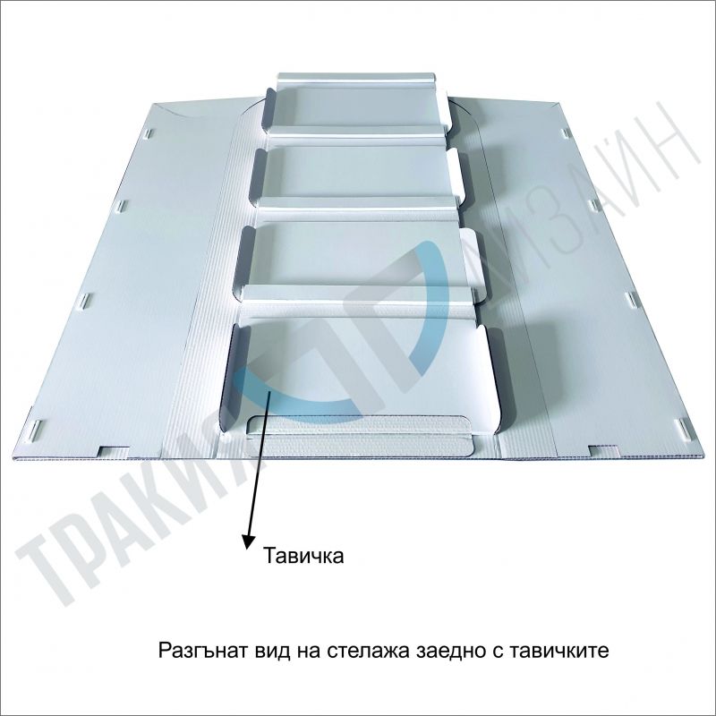 - Тракия дизайн предлага няколко варианта за тяхната изработка. Примерните стелажи посочени в магазина са с често срещани размери и брой на тавичките. Разработените от нас проекти са с възможност за промяна на множество параметри, като: големина, брой на тавичките, здравина / в зависимост от това колко са тежки продуктите / и др.